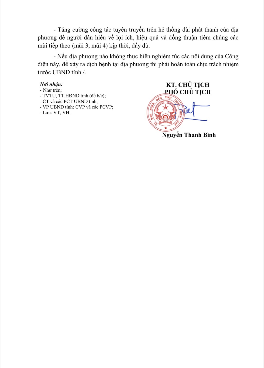 Nếu địa phương nào không thực hiện nghiêm túc các nội dung của Công điện này, để xảy ra dịch bệnh tại địa phương thì phải hoàn toàn chịu trách nhiệm trước UBND tỉnh.
