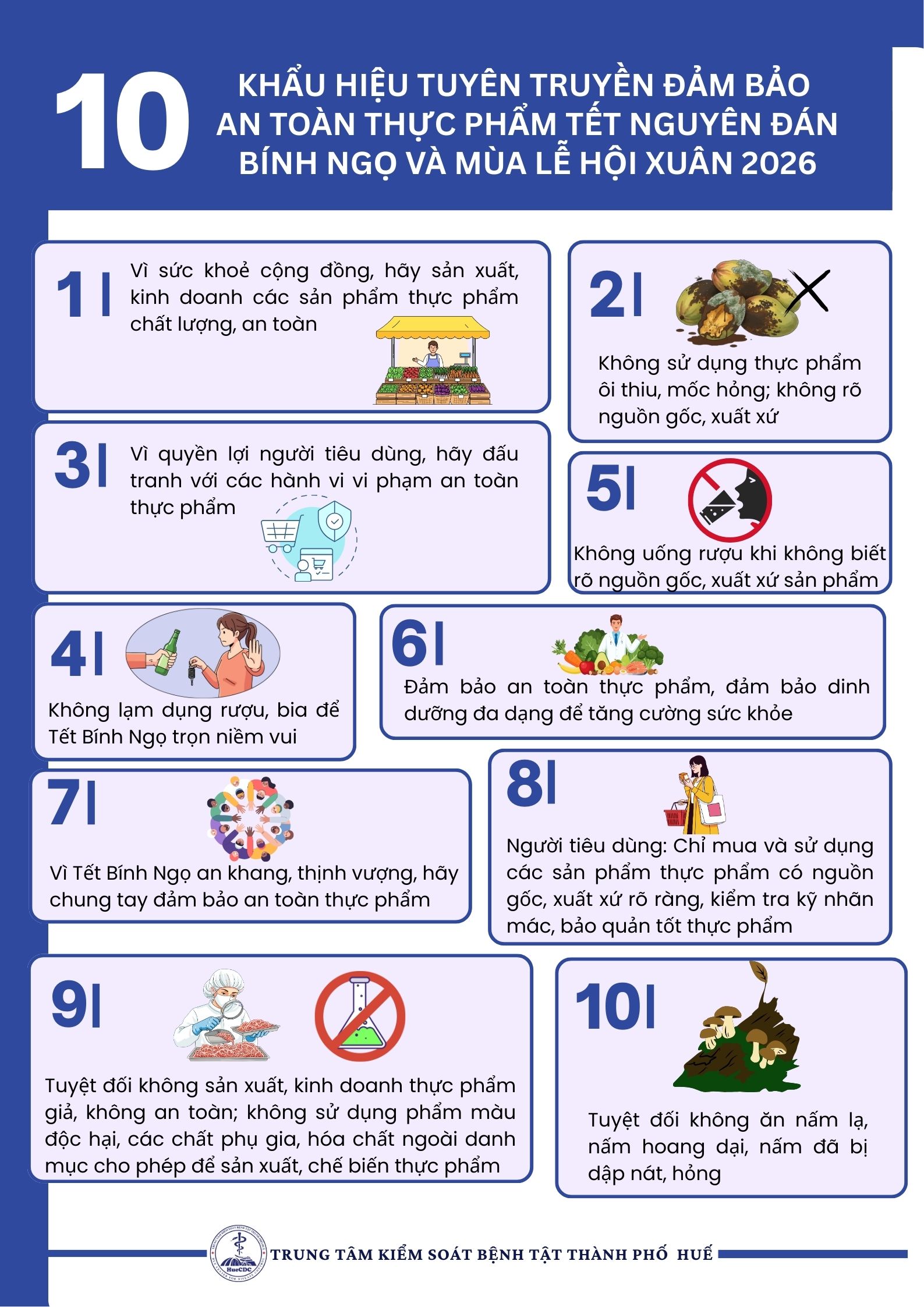 Infographic về 10 Khẩu hiệu tuyên truyền đảm bảo an toàn thực phẩm Tết Nguyên đán Bính Ngọ và Mùa lễ hội Xuân 2026.