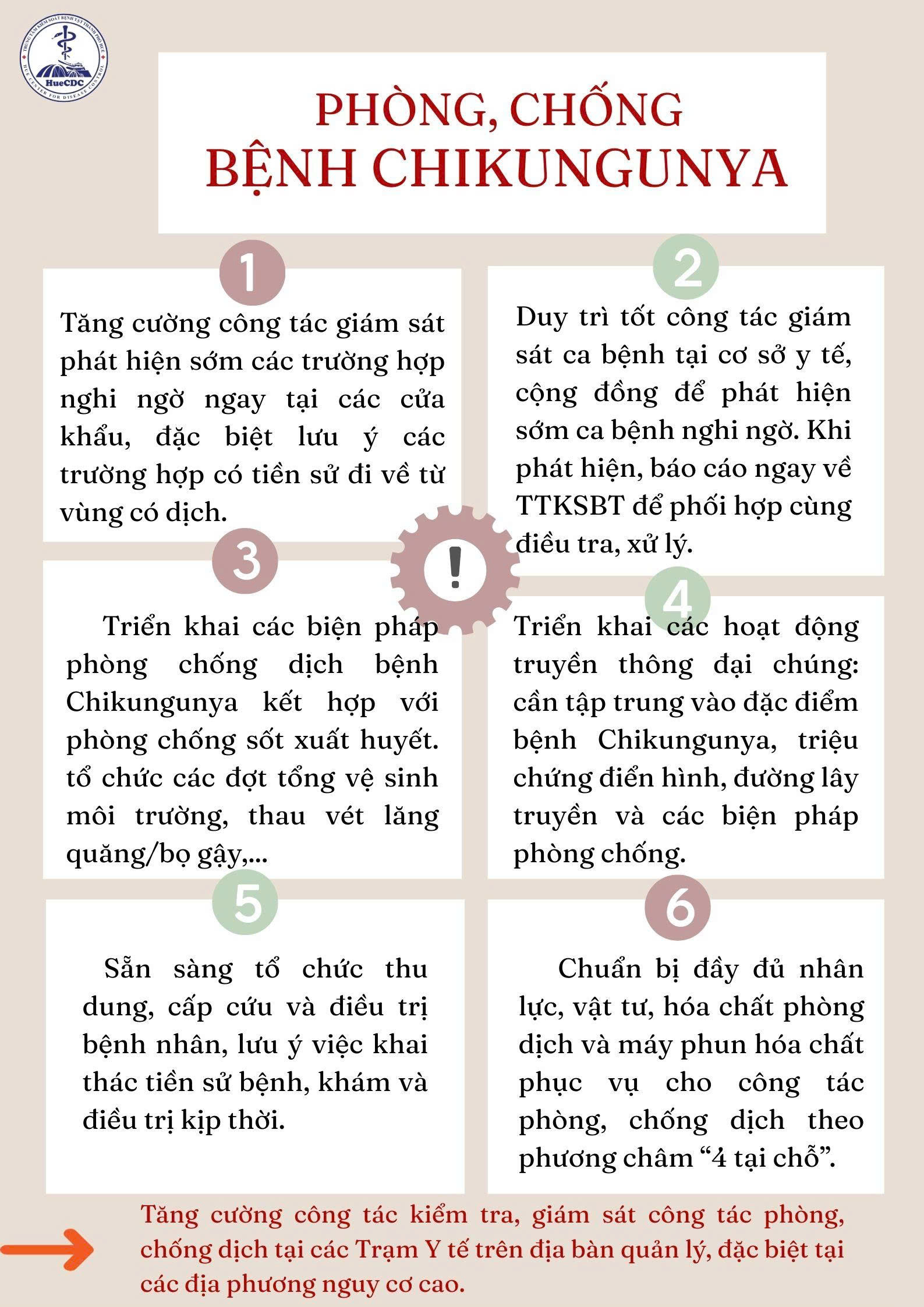 - Triển khai các biện pháp công tác phòng chống dịch bệnh Chikungunya kết hợp với phòng chống sốt xuất huyết như giám sát, điều tra chỉ số véc tơ, giám sát muỗi truyền bệnh tại các cửa khẩu và cộng đồng theo quy định; chủ động tổ chức các đợt tổng vệ sinh môi trường, thau vét lăng quăng/bọ gậy, phun hóa chất diệt muỗi chủ động…đảm bảo xử lý triệt để ngay khi phát hiện các ca nghi ngờ mắc bệnh, không để dịch bùng phát tại địa phương.