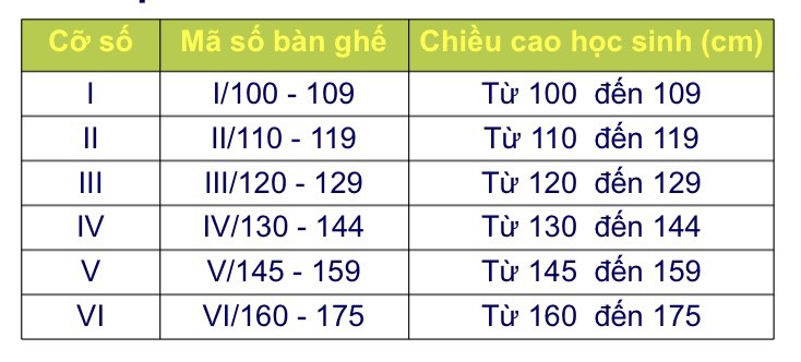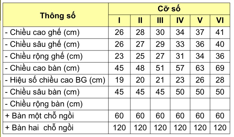 2. Kích thước bàn ghế theo tầm vóc học sinh: