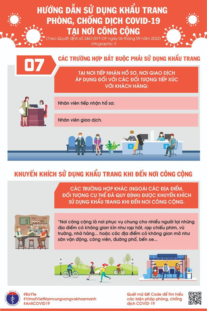 Bộ Y tế vừa ban hành Quyết định số 2447/QĐ-BYT ngày 06/9/2022 về việc hướng dẫn sử dụng khẩu trang nơi công cộng, đồng thời chỉ rõ một số đối tượng, địa điểm bắt buộc phải đeo khẩu trang, cụ thể tại hướng dẫn, Bộ Y tế chỉ ra các trường hợp, địa điểm bắt buộc phải sử dụng khẩu trang bao gồm: