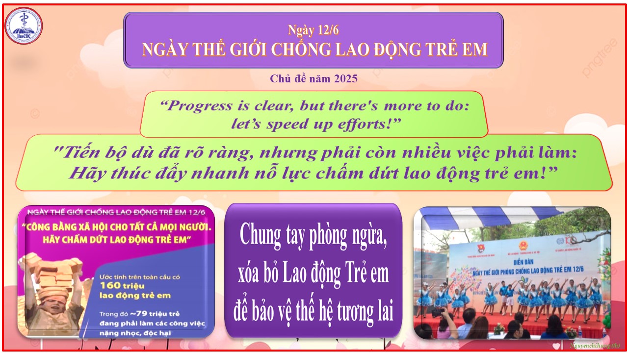 Ngày 12/6/2025, Ngày Thế giới chống Lao động Trẻ em có chủ đề: "Tiến bộ dù đã rõ ràng, nhưng vẫn còn nhiều việc cần phải làm: Hãy thúc đẩy nhanh nỗ lực chấm dứt lao động trẻ em!” - “Progress is clear, but there's more to do: let’s speed up efforts!”, nhằm nhấn mạnh tính cấp bách của việc đẩy nhanh tiến độ xóa bỏ LĐTE trên toàn thế giới.