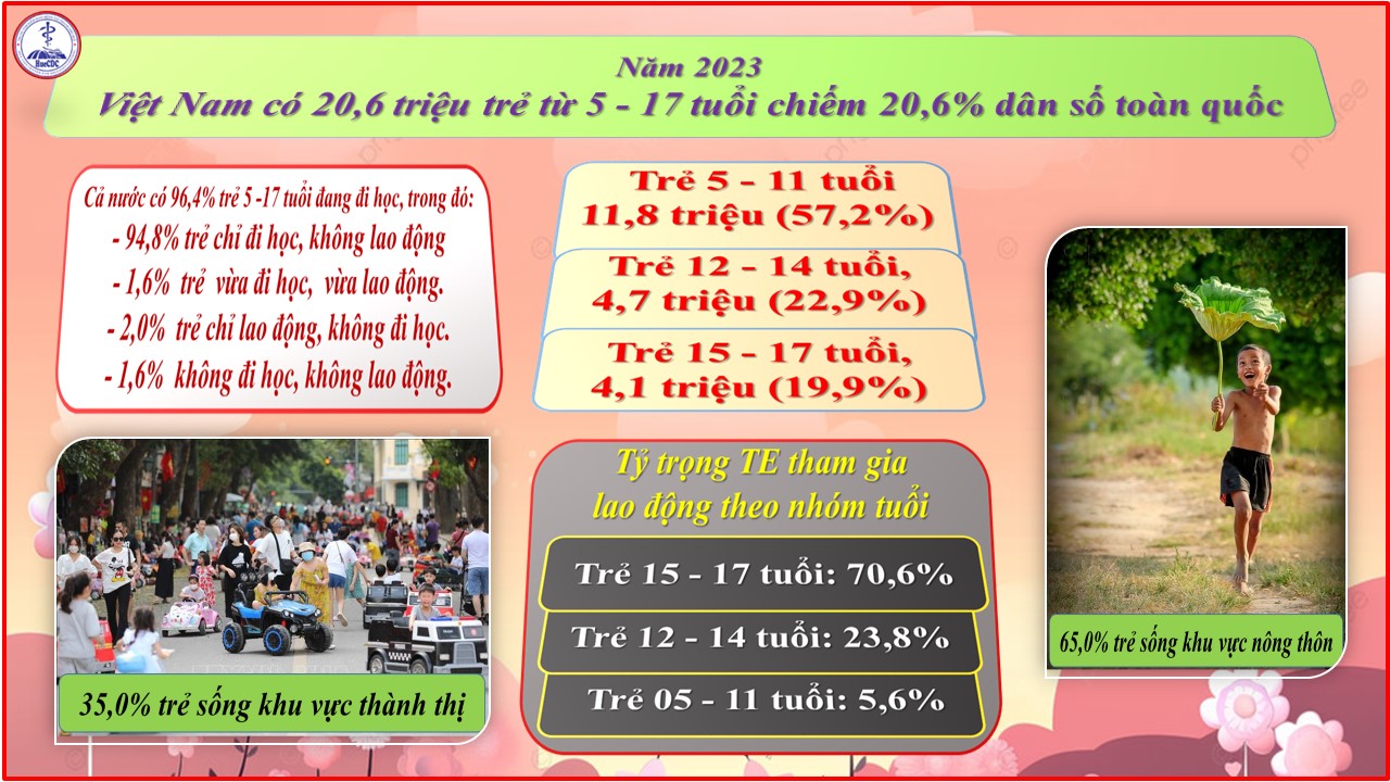 Theo Tổng Cục Thống kê, năm 2023 dân số trẻ em từ 5-17 tuổi của Việt Nam là 20,6 triệu người, chiếm 20,6% tổng dân số toàn quốc. Trong đó, trẻ em nhóm 5-11 tuổi là 11,8 triệu người, chiếm 57,2%; trẻ em nhóm 12-14 tuổi là 4,7 triệu người chiếm 22,9%; Trẻ em nhóm 15-17 tuổi là 4,1 triệu người chiếm 19,9%. Trẻ em sống ở khu vực thành thị chiếm 35,0%, ở khu vực nông thôn chiếm 65,0%.