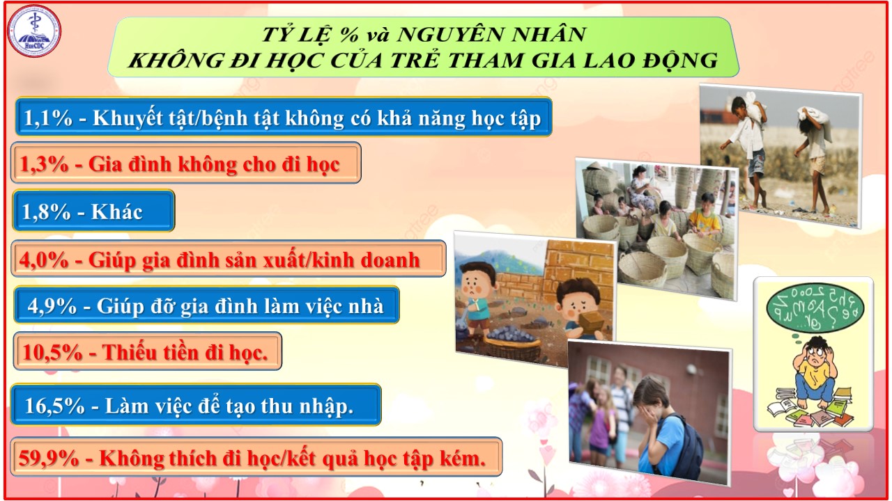 Trẻ em tham gia lao động thường bị hạn chế có cơ hội được đi học. Đối với nhóm trẻ không tham gia lao động thì hầu hết trẻ em là đang đi học (98,3%), tỷ trọng trẻ em không đi học ở nhóm này chỉ chiếm 1,7%. Điều này cho thấy nếu trẻ em có cơ hội học tập nhiều hơn thì càng ít khả năng tham gia lao động và sẽ ít có khả năng trở thành lao động trẻ em.