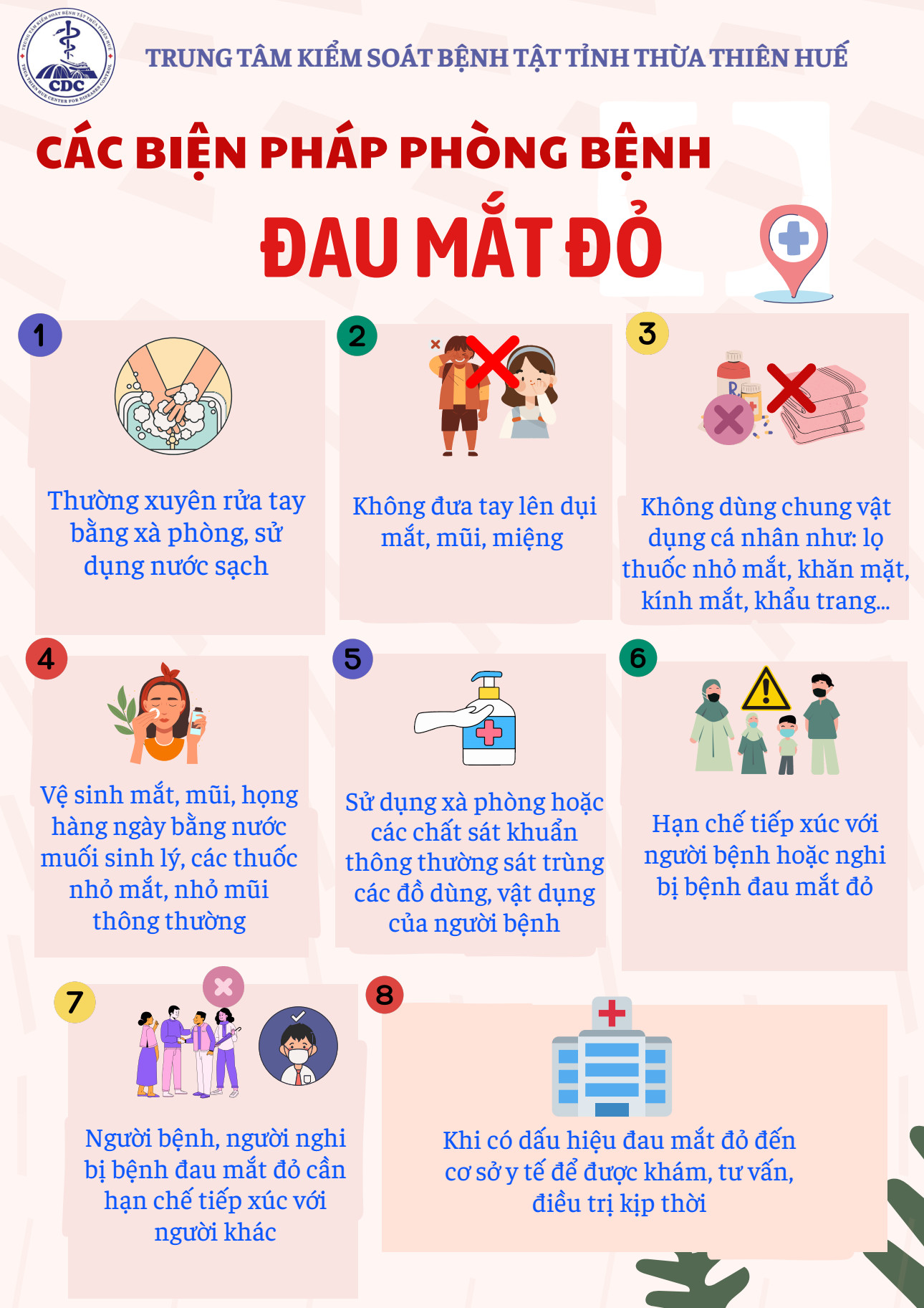 7. Người có các dấu hiệu Đau mắt đỏ cần đến cơ sở y tế để được khám, tư vấn, điều trị kịp thời; không tự ý điều trị khi chưa có hướng dẫn của cán bộ y tế để tránh biến chứng nặng.