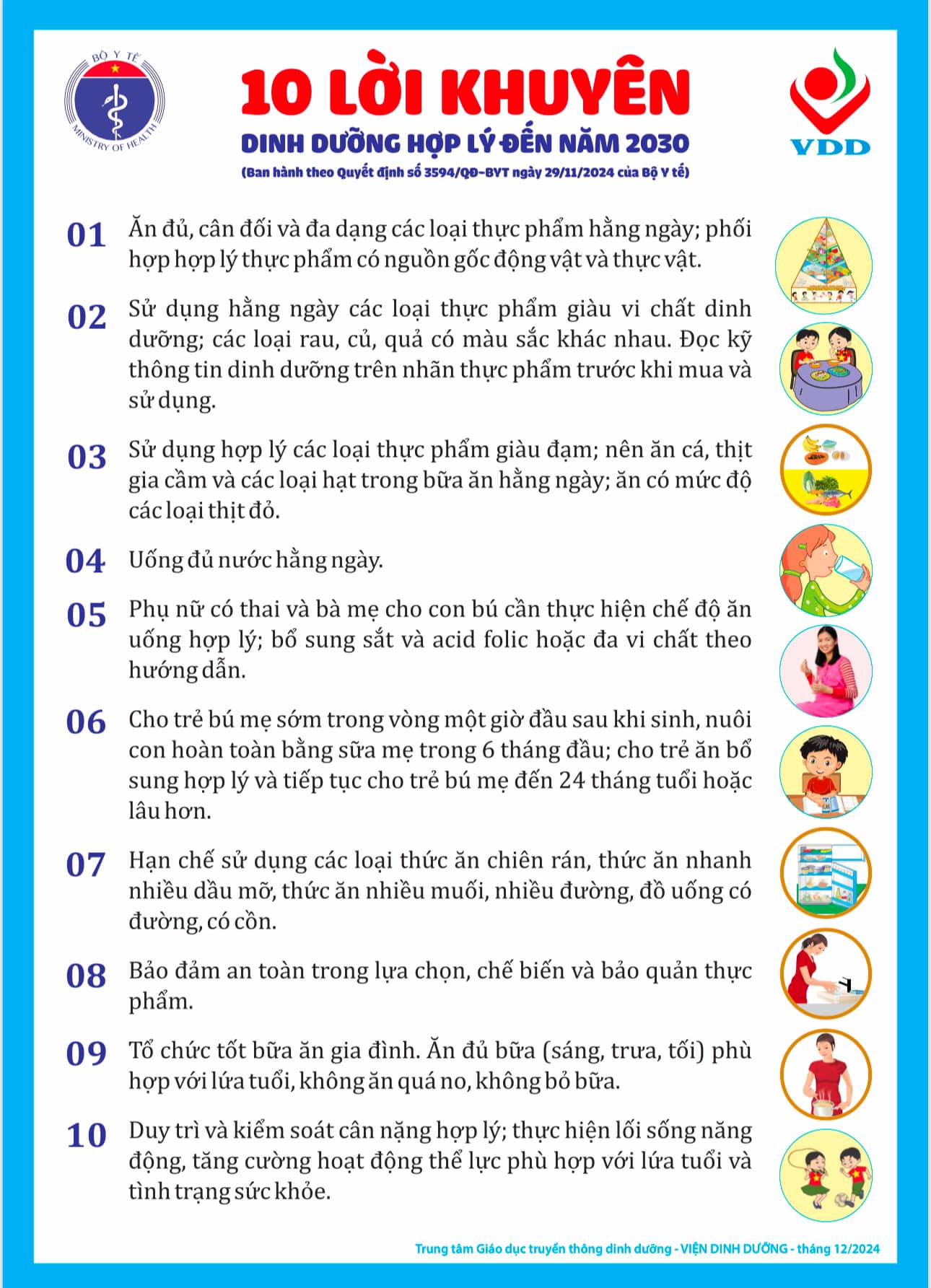 Ngày 29/11/2024, Bộ Y tế đã ban hành Quyết định 3594/QĐ-BYT ban hành “Mười lời khuyên dinh dưỡng hợp lý đến năm 2030".