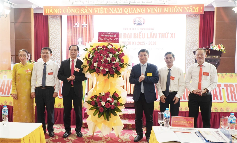 Đồng chí Nguyễn Thanh Bình - Thường vụ Thành ủy, Phó Chủ tịch UBND thành phố tặng hoa chúc mừng Đại hội Đảng bộ Sở Y tế