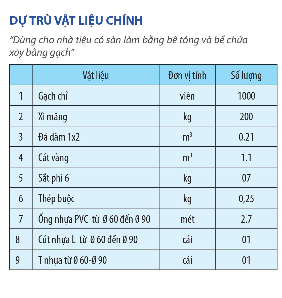 Dự trù nguyên vật liệu chính xây dựng nhà tiêu