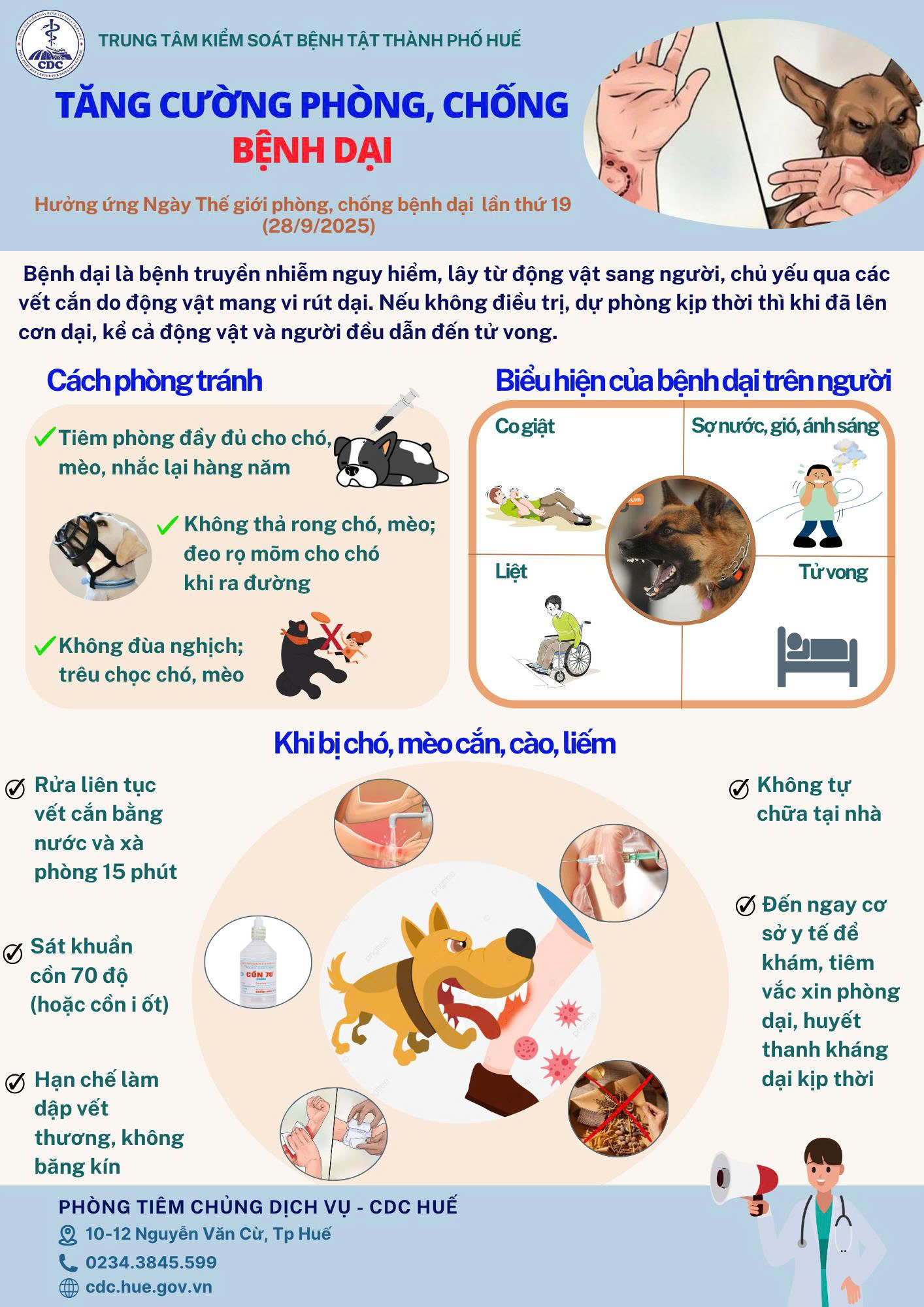 Thực hiện công văn của Bộ Y tế và Trung tâm truyền thông giáo dục sức khỏe tăng cường truyền thông phòng, chống bệnh Dại và hưởng ứng ngày Thế giới phòng chống bệnh Dại lần thứ 19 (ngày 28/9/2025). Để tăng cường công tác phòng, chống bệnh Dại và hưởng ứng ngày Thế giới phòng chống bệnh Dại lần thứ 19 (ngày 28/9/2025), cần quan tâm chỉ đạo các đơn vị, địa phương tập trung triển khai một số nội dung nhằm tăng cường phòng, chống bệnh Dại.