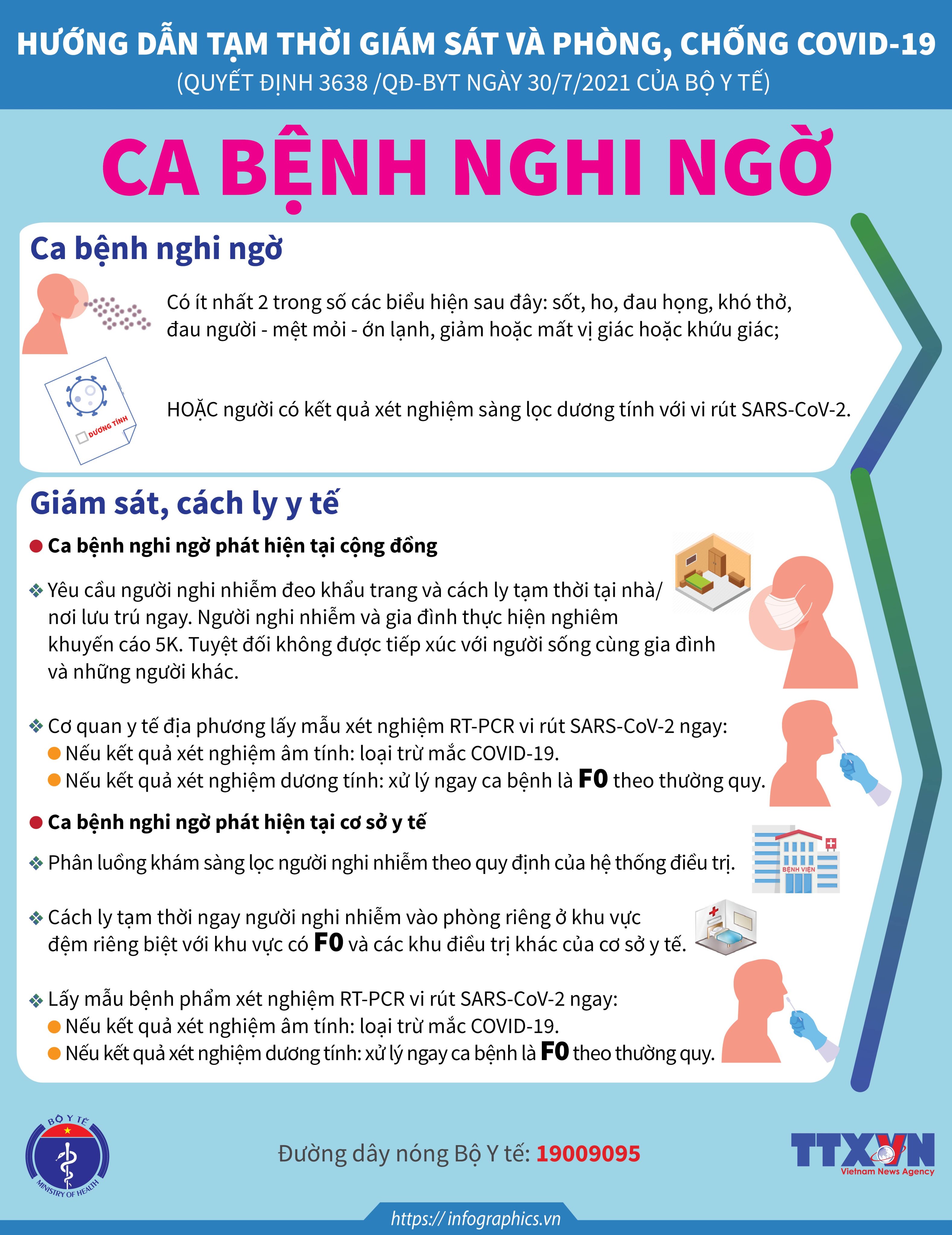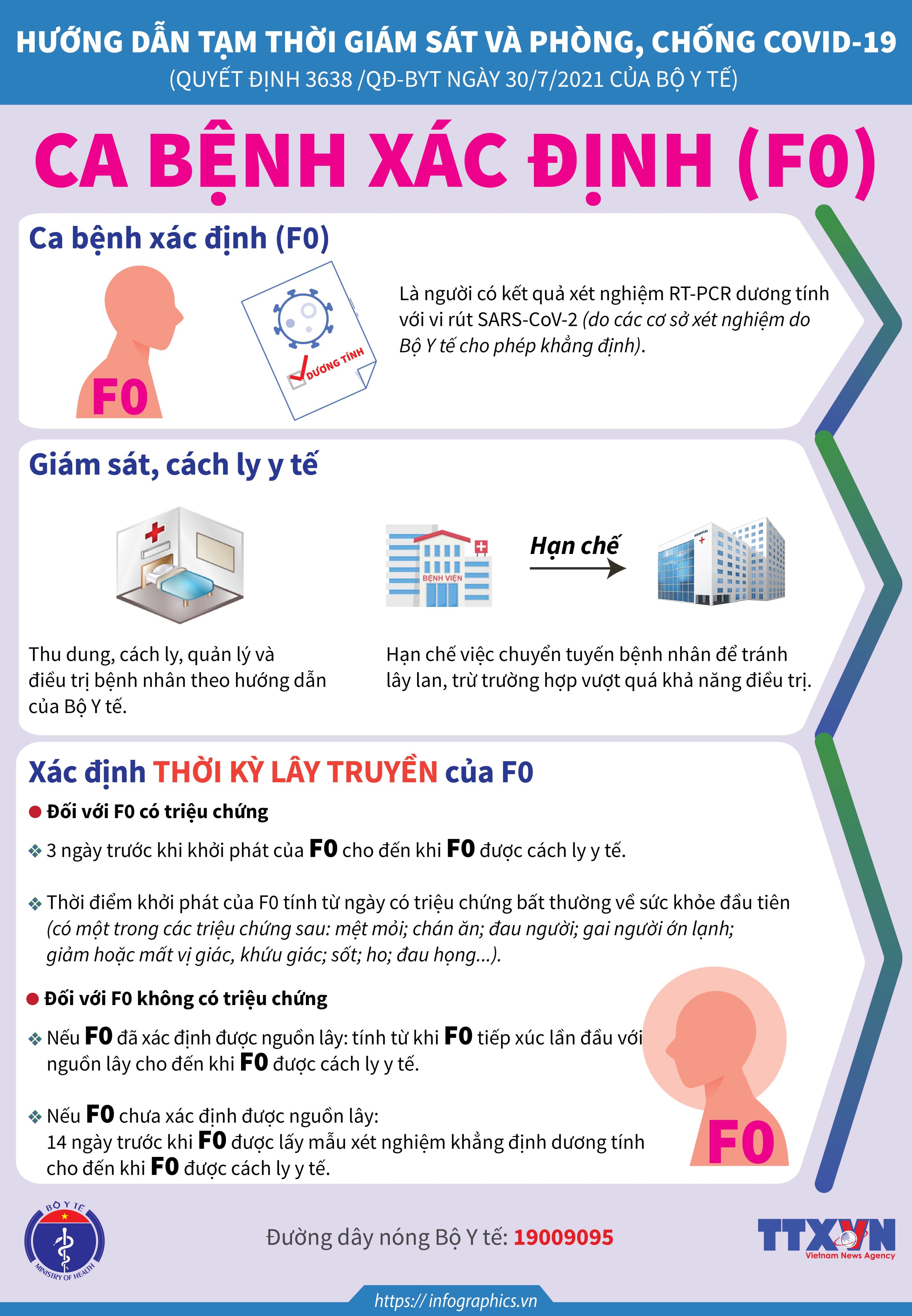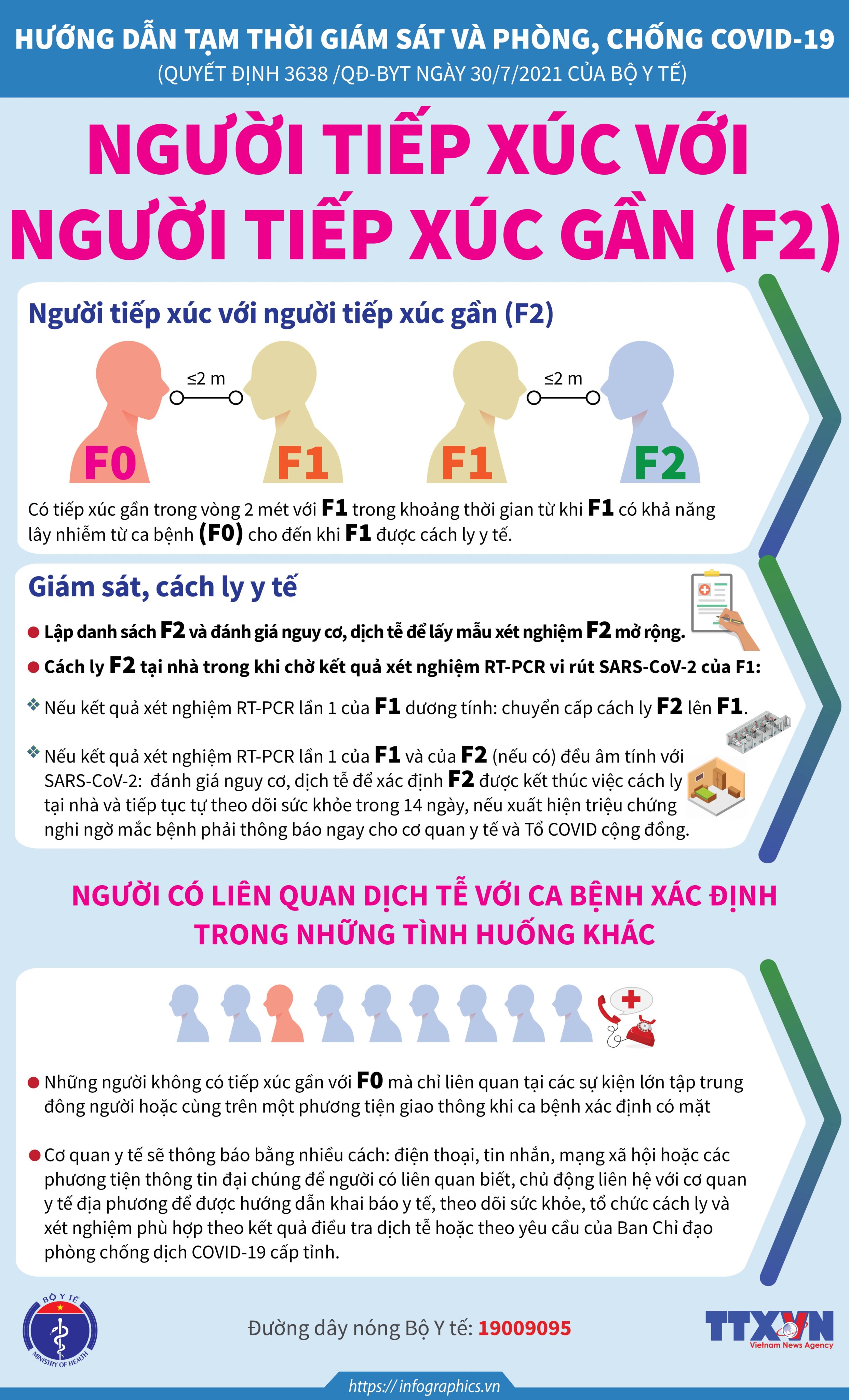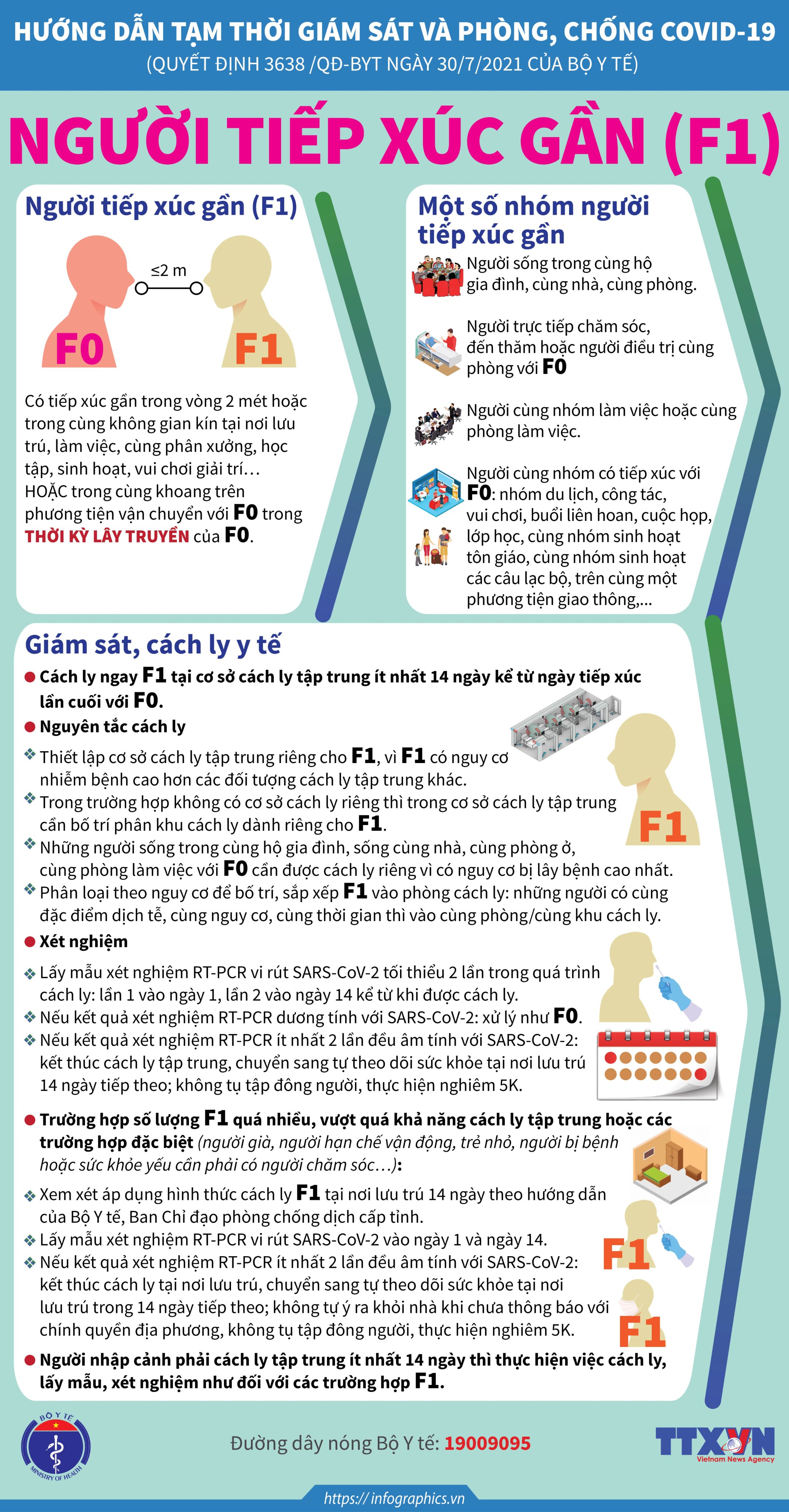 1. Infographics về Hướng dẫn giám sát, cách ly y tế phòng, chống dịch COVID-19 ban hành tại Quyết định 3638/QĐ-BYT ngày 30/7/2021, đã được cập nhật đối với các nhóm đối tượng: - Ca bệnh xác định (F0); - Người tiếp xúc gần (F1); - Người tiếp xúc với người tiếp xúc gần (F2); - Ca bệnh nghi ngờ; Các trường hợp có liên quan dịch tễ với ca bệnh xác định; - Hoạt động của Tổ COVID cộng đồng. Tải Infographics và file thiết kế tại link: https://1drv.ms/u/s!Amm0pPafka61g4MWjDhyLTdMgaoBQQ?e=rJ9K6m 2. Infographic về hướng dẫn cách ly y tế cho Người nhập cảnh đã tiêm đủ vắc xin phòng COVID-19 (Chi tiết tại Công văn 6288/BYT-MT ngày 04/8/2021 của Bộ Y tế). Tải Infographic và file thiết kế tại link: https://1drv.ms/u/s!Amm0pPafka61g4Mh0vnOvI3SF9FwDw?e=nSFu3T