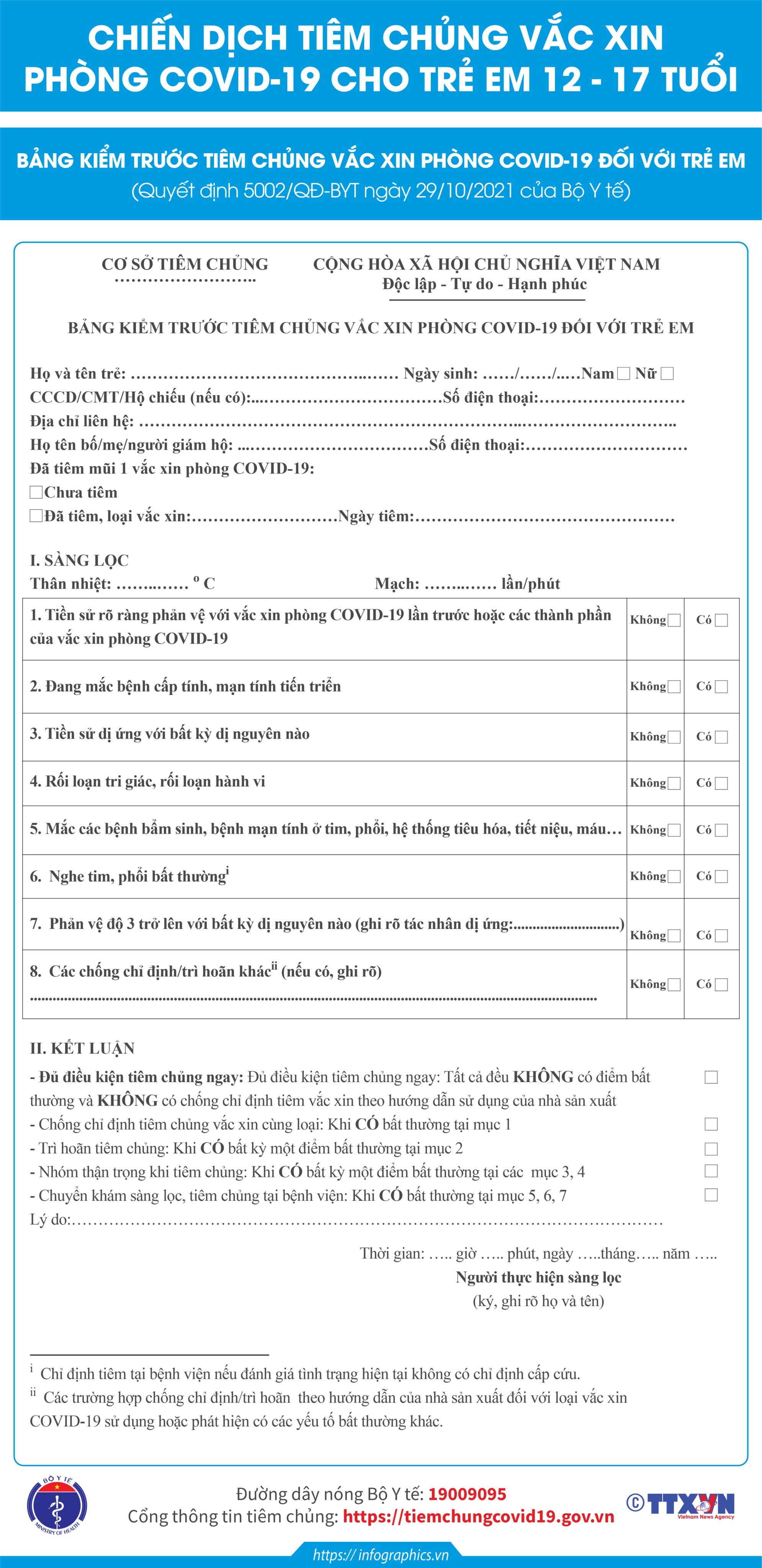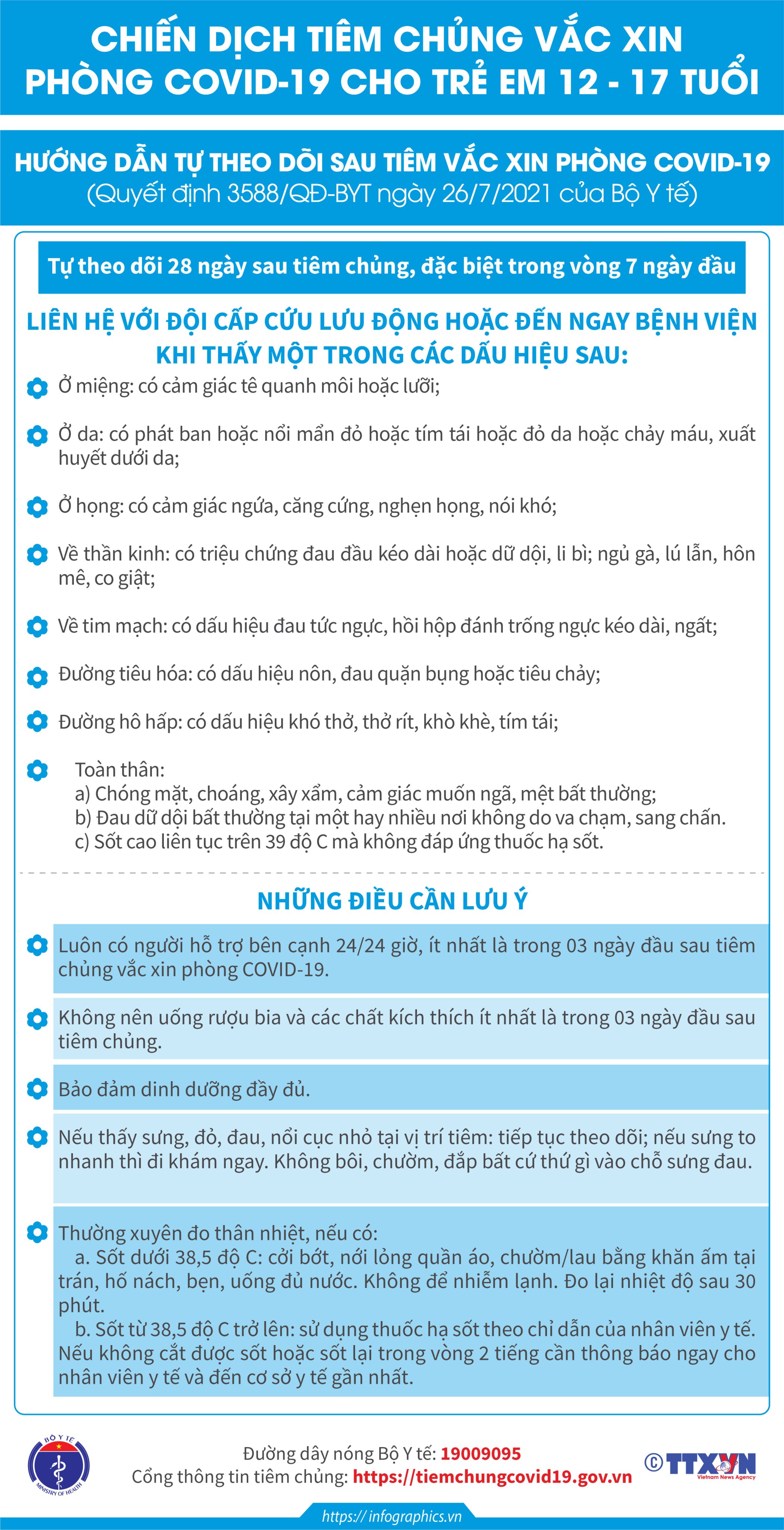 Bộ Infographic về Chiến dịch tiêm chủng vắc xin phòng COVID-19 cho trẻ em 12 - 17 tuổi, được xây dựng căn cứ trên Sổ tay hướng dẫn thực hành tiêm chủng vắc xin COVID-19 cho trẻ em 12 - 17 tuổi; Quyết định 3588/QĐ-BYT ngày 26/7/2021 của Bộ Y tế; Công văn 8688 /BYT-DP ngày 14/10/ 2021 của Bộ Y tế; Quyết định 5002/QĐ-BYT ngày 29/10/2021 của Bộ Y tế.
