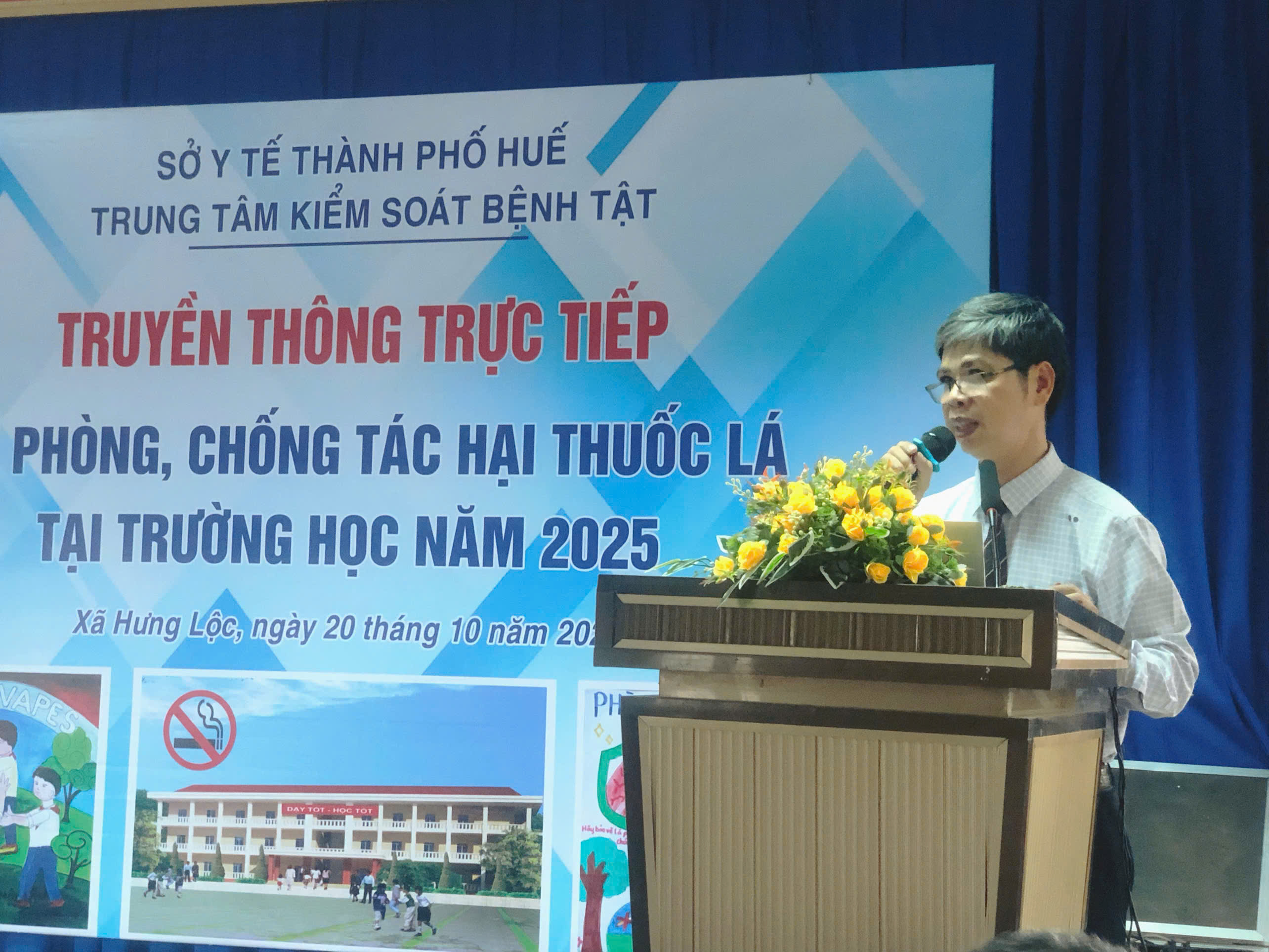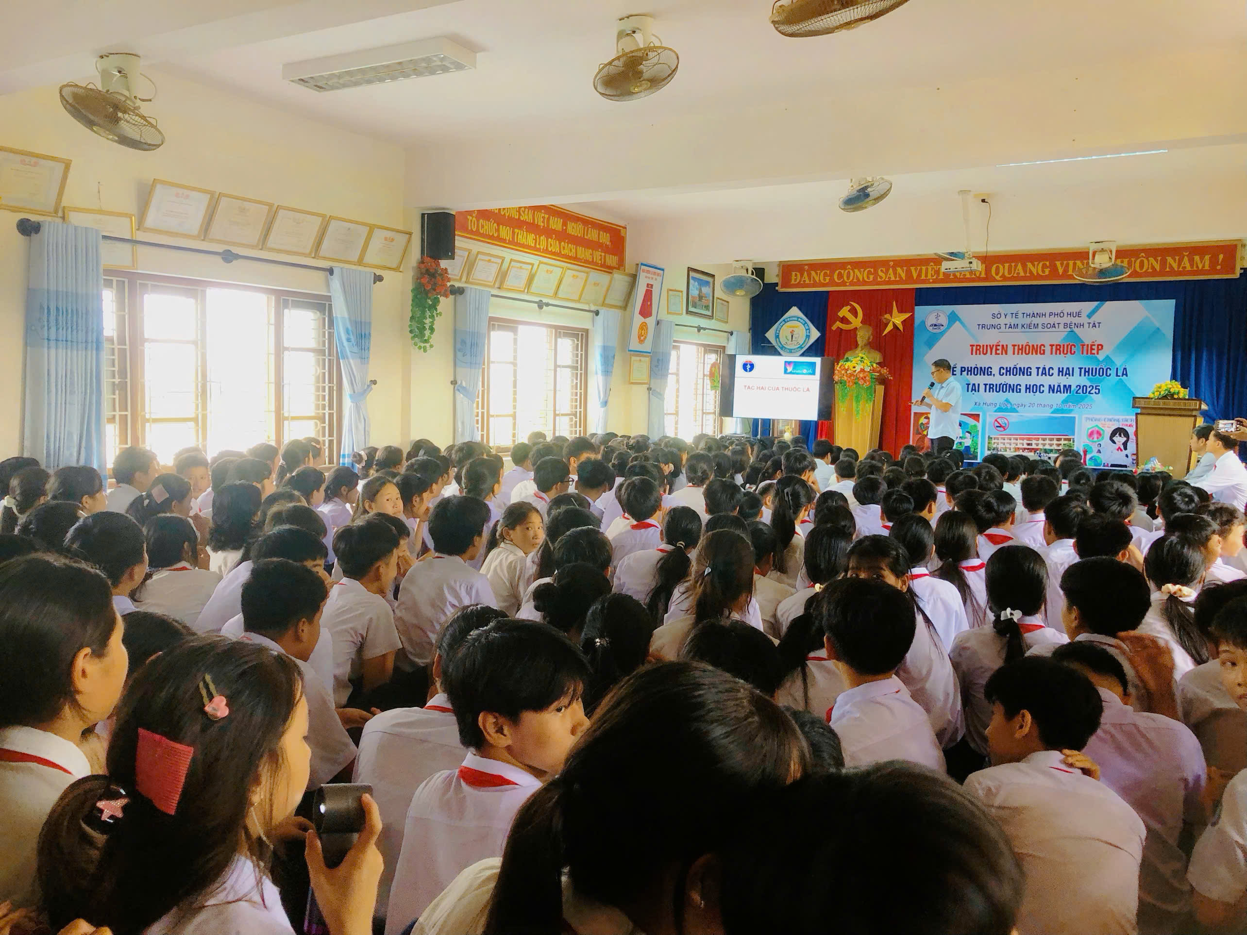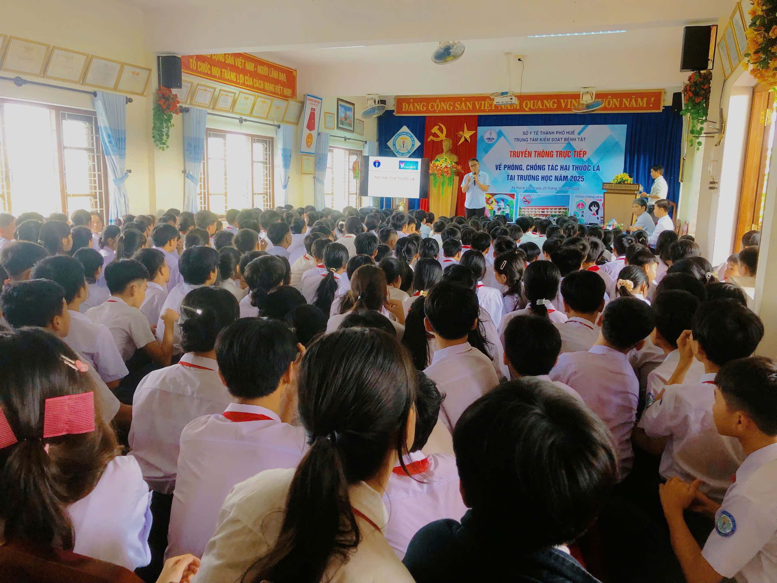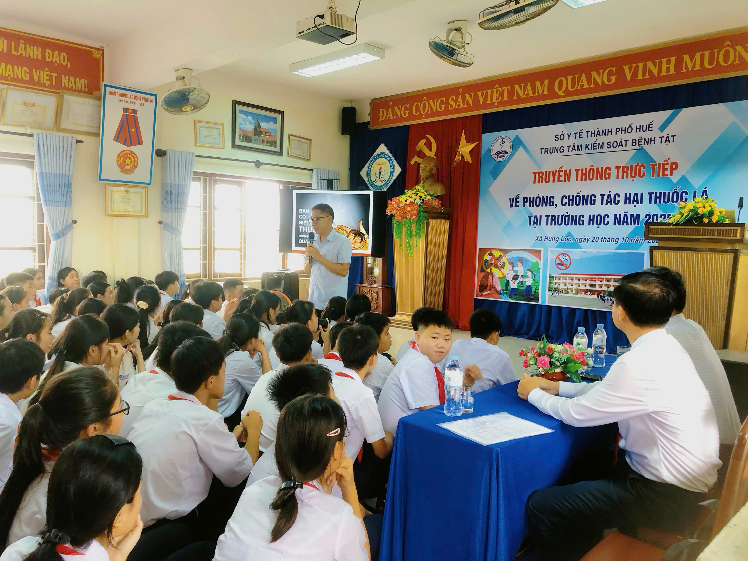 Thực hiện Kế hoạch số 1577/KSBT-TTGDSK ngày 13/10/2025 của Trung tâm kiểm soát bệnh tật thành phố Huế về việc truyền thông trực tiếp phòng chống tác hại thuốc lá tại trường học năm 2025. Ngày 20/10/2025, Trung tâm Kiểm soát bệnh tật thành phố Huế đã phối hợp với UBND xã Hưng Lộc tổ chức truyền thông trực tiếp cho giáo viên, học sinh tại các trường học về phòng, chống tác hại thuốc lá. Tham dự buổi truyền thông trực tiếp, có ThS.BS Lê Trung Quân - chuyên viên Khoa Truyền thông giáo dục sức khỏe - Trung tâm Kiểm soát bệnh tật có viên chức Khoa Truyền thông giáo dục sức khỏe làm báo cáo viên tại buổi truyền thông và các giáo viên, học sinh trường THCS Lộc Bổn, THCS Lộc Sơn cùng tham dự.