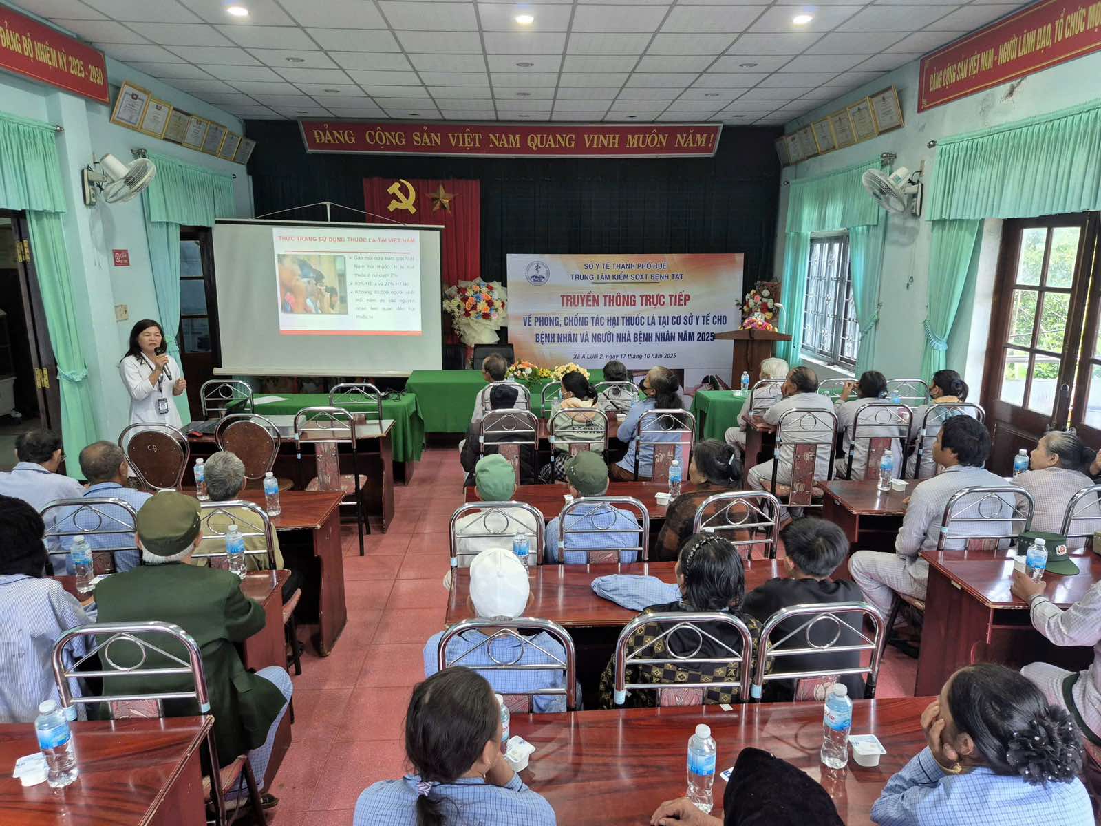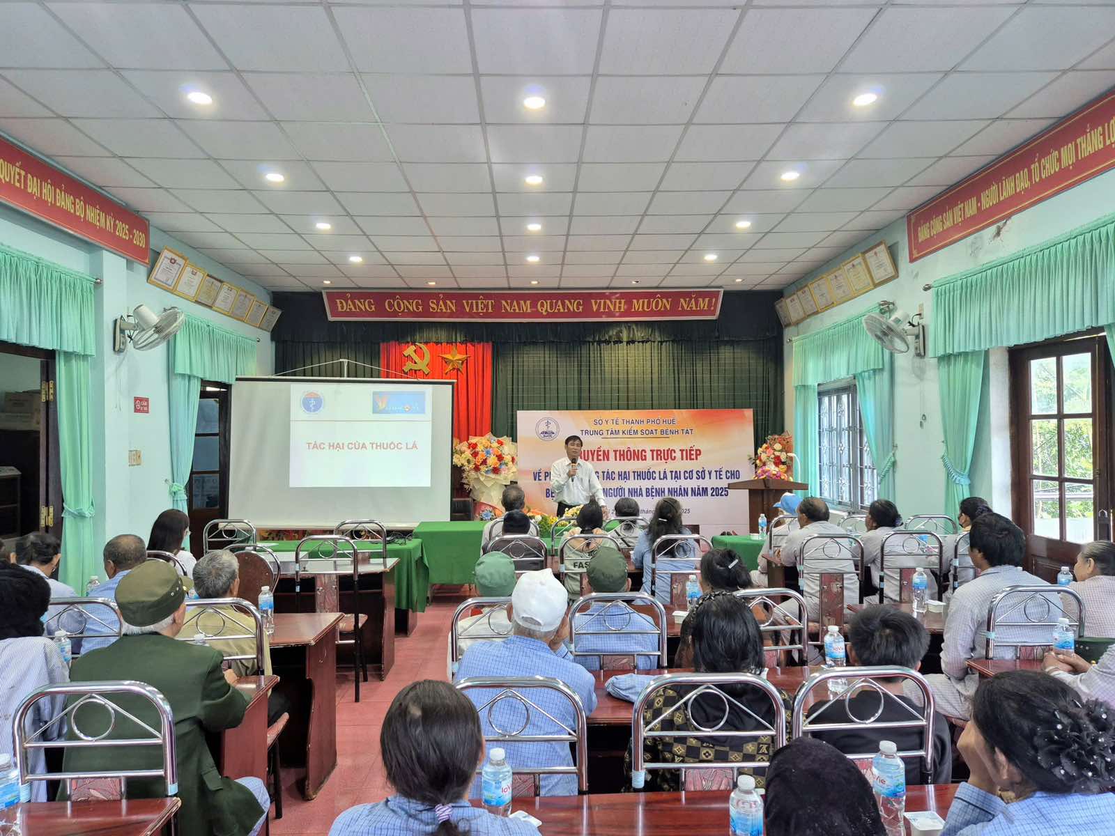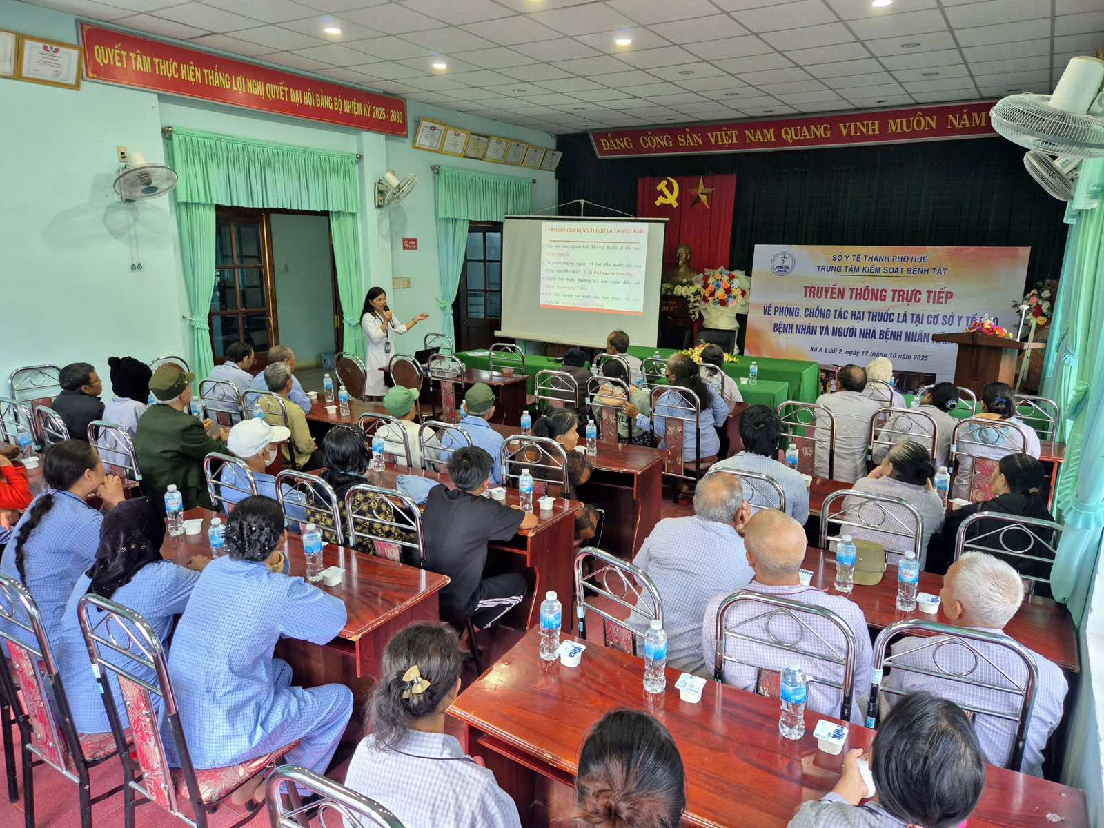 Thực hiện kế hoạch số 1559/KSBT-TTGDSK ngày 09 tháng 10 năm 2025 của Trung tâm Kiểm soát bệnh tật thành phố Huế về truyền thông trực tiếp về phòng, chống tác hại thuốc lá tại cơ sở y tế năm 2025. Ngày 17-18/10/2025, Trung tâm Kiểm soát bệnh tật thành phố Huế đã phối hợp với Trung tâm Y tế A Lưới tổ chức truyền thông trực tiếp cho nhân viên y tế, bệnh nhân, người nhà bệnh nhân trên địa bàn về phòng, chống tác hại thuốc lá. Tham dự buổi truyền thông trực tiếp, về phía Trung tâm Kiểm soát bệnh tật có viên chức Khoa Truyền thông giáo dục sức khỏe, về phía Trung tâm Y tế A Lưới có BSCKII. Hồ Bách Thắng - Giám đốc Trung tâm Y tế A Lưới làm báo cáo viên tại buổi truyền thông, đại diện lãnh đạo Phòng KH-NV - Điều dưỡng - TTGDSK và các nhân viên y tế, bệnh nhân, người nhà bệnh nhân cùng tham dự.