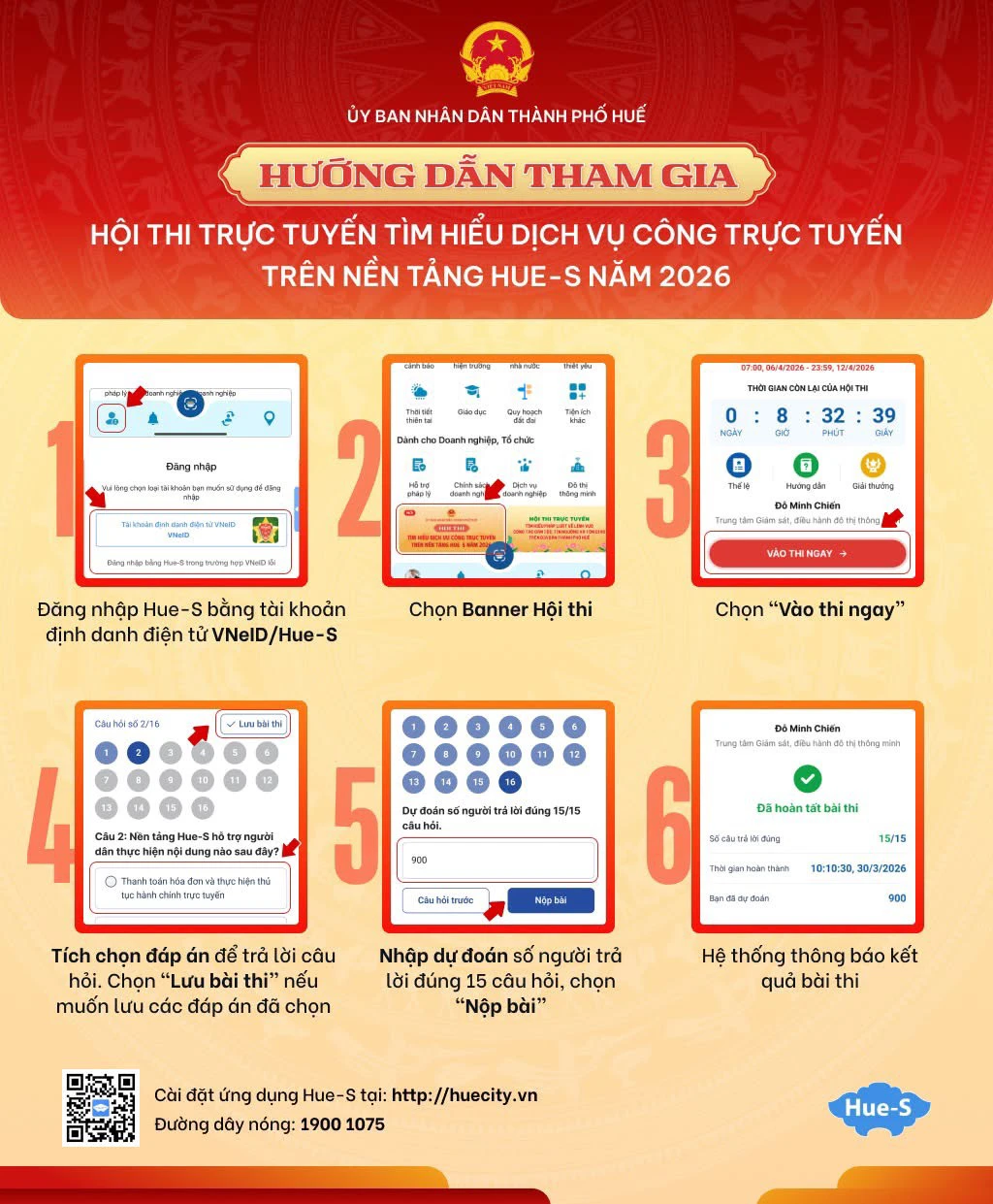 - Hướng dẫn cách thức tham gia Hội thi trên nền tảng Hue-S tại địa chỉ https://sukien.hue.gov.vn/HoithiDVCTT2026.