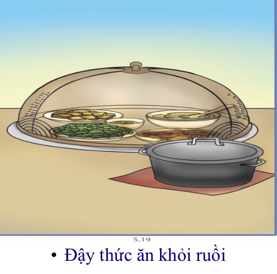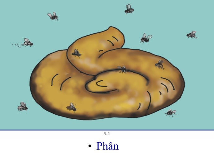 - Ruồi: Ruồi thường đậu trên phân, sau đó chúng bay lên rồi đậu vào đồ ăn, làm cho đồ ăn dính những hạt phân nhỏ li ti, mà sau đó chúng ta ăn phải.