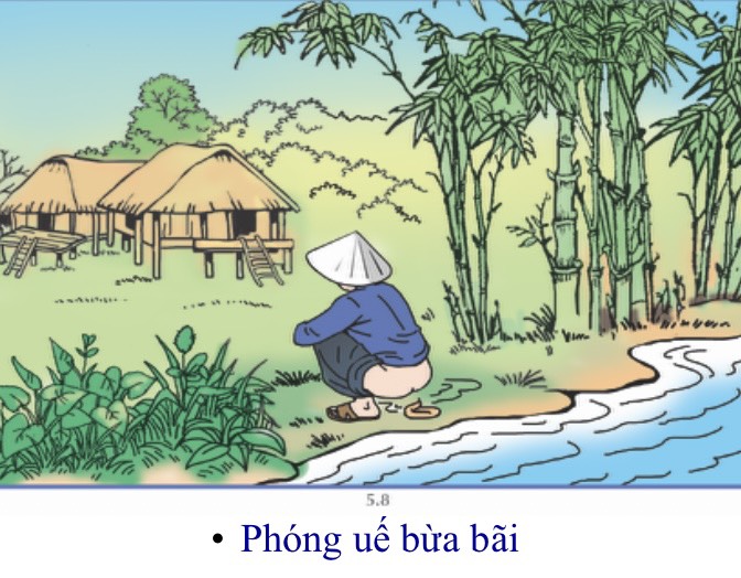 - Chất lỏng: Phóng uế bừa bãi, phân có thể chảy xuống sông và suối, làm ô nhiễm nguồn nước làm cho nước không đảm bảo để uống. Phân có thể ngấm vào nước giếng, do nhà tiêu có vị trí quá gần giếng.