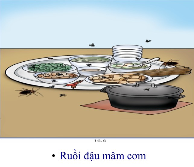Ruồi mang mầm bệnh từ những nơi bẩn thỉu như đống rác hay phân trong nhà vệ sinh và đậu lên thức ăn: