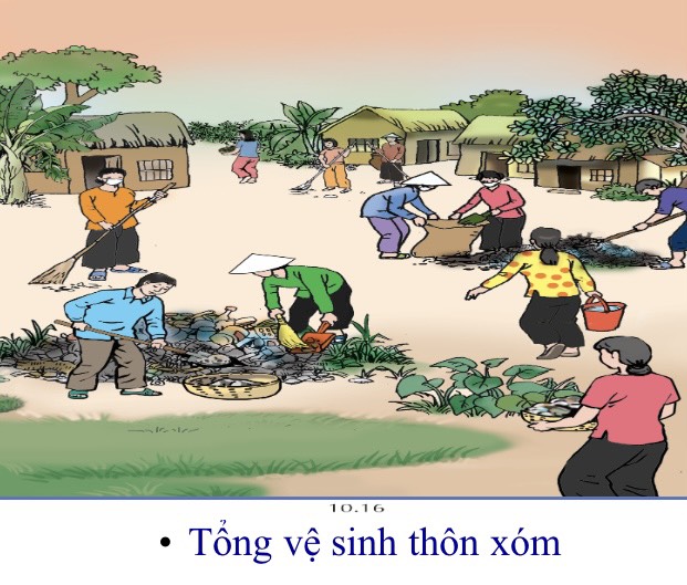 Các khuyến nghị cần thực hiện: - Tuyệt đối không xả rác ra đường phố, trên mặt đất. - Bỏ rác đúng nơi qui định như thùng rác có nắp đậy. - Sử dụng rác hữu cơ để ủ, đốt hoặc đem chôn. - Rác vô cơ có thể bán, tái chế hoặc đem chôn. - Sử dụng hố rác và thường xuyên đốt rác để không bốc mùi hôi thối. - Không để nước tù đọng quanh nhà. Khơi thông rãnh thoát nước. - Hàng tuần cả thôn làm tổng vệ sinh. - Gia súc chết phải đem đi chôn ngay. - Thông báo cho cán bộ về các bệnh viện hoặc nhà máy gây ô nhiễm (nếu có).