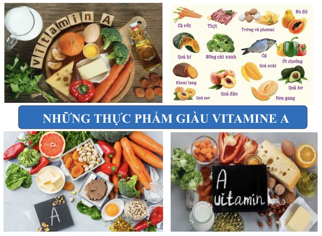 Các loại thực phẩm giàu vitamin A gồm: Gan động vật, Khoai lang, Cà rốt, Rau bina (còn gọi cải bó xôi hoặc rau chân vịt), Bí ngô, Ớt chuông, Cà chua, Bông cải xanh…