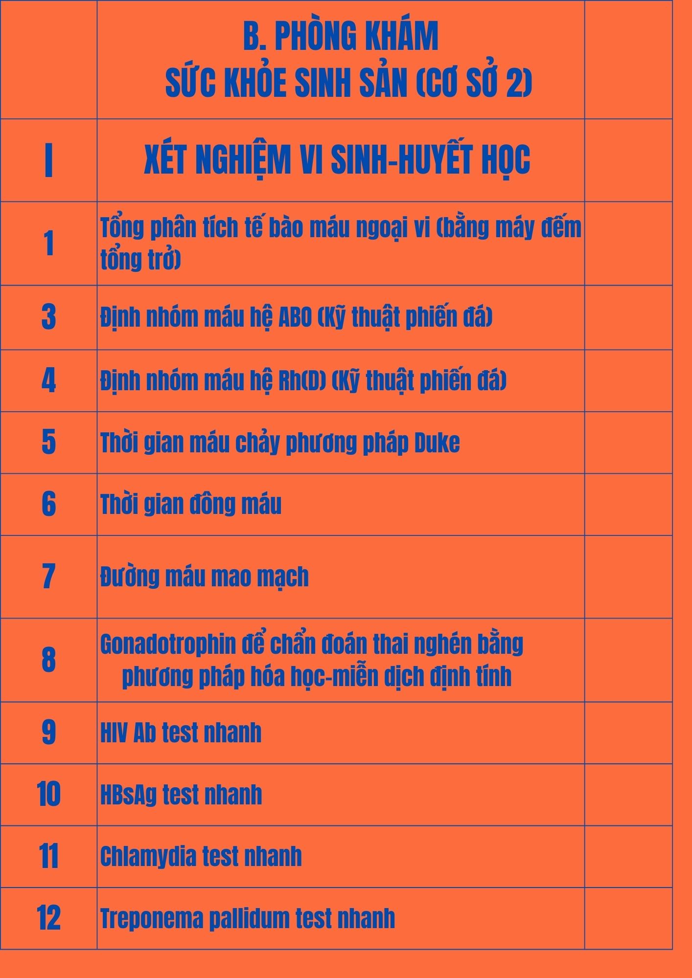 Bảng giá dịch vụ Xét nghiệm